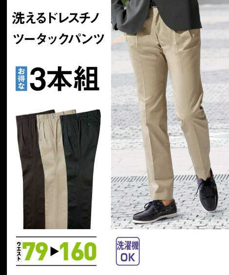 スラックス 大きいサイズ ビジネス カジュアル メンズ ツータック ドレス チノ3本組 パンツ 黒+ブラウン+ベージュ ウエスト130/140/150/160cm ニッセン