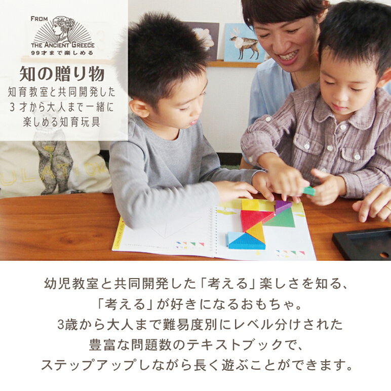 テキストブックには低年齢から楽しく取り組める初級レベルの絵合わせパズルや、大人でも難しいプレートのくぼみを埋めて三角形をつくるパズルやピラミッドを作る立体パズルなど、ボリュームたっぷりと109問収録。