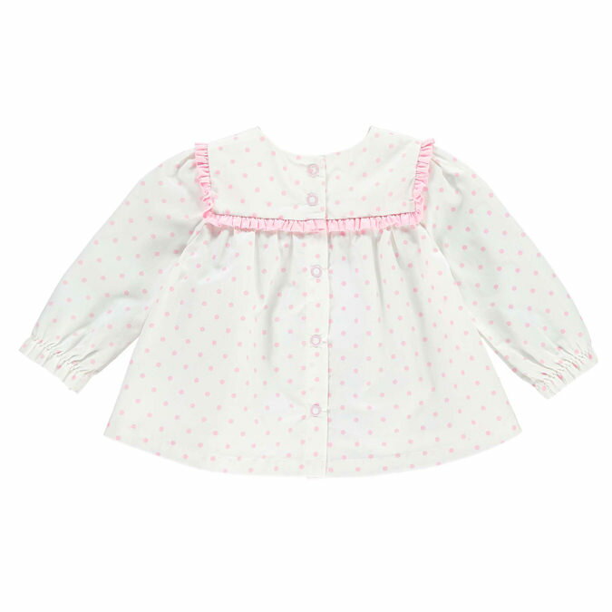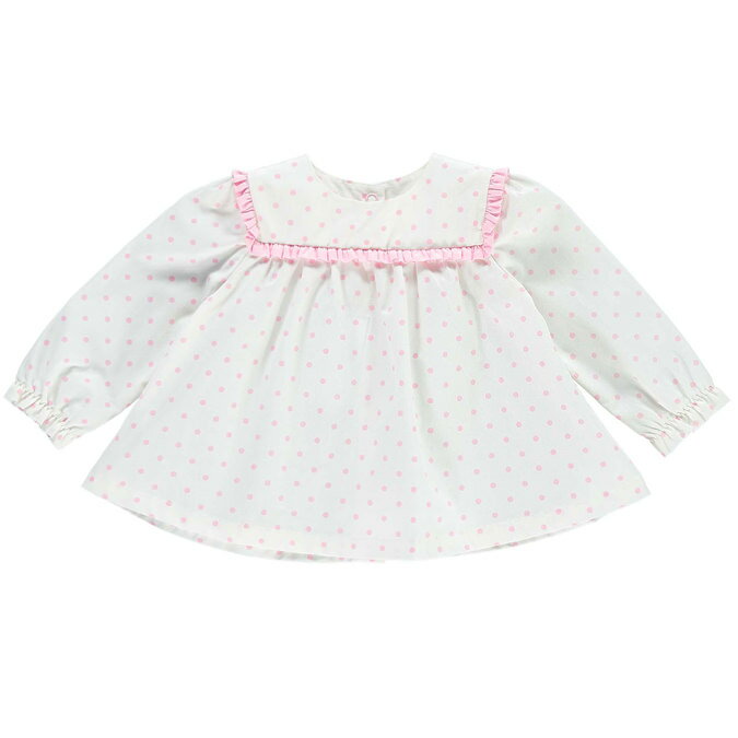 可愛らしい水玉とフリルデザインのトップスとトラウザー。